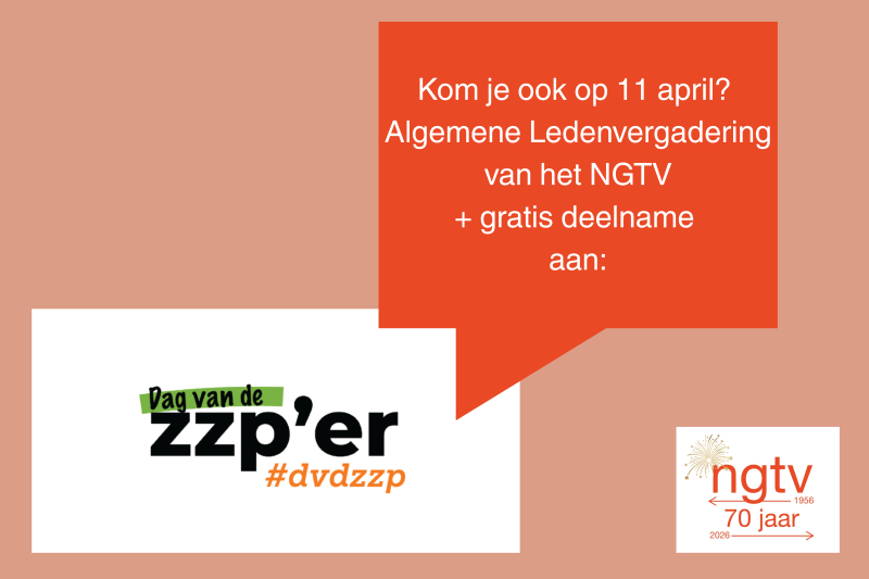 De Algemene Ledenvergadering (ALV) van het NGTV vindt plaats op zaterdag 11 april van 10.00 tot 11.30 uur in Hart van Holland te Nijkerk. Na de Algemene Ledenvergadering kunnen leden deelnemen aan de Dag van de ZZP’er. Een dag vol inspiratie, kennis en netwerkmogelijkheden. De ALV-agenda en stukken vind je vanaf 31 maart op onze website (na inlog): https://ngtv.nl/nl/agenda/product/57/58